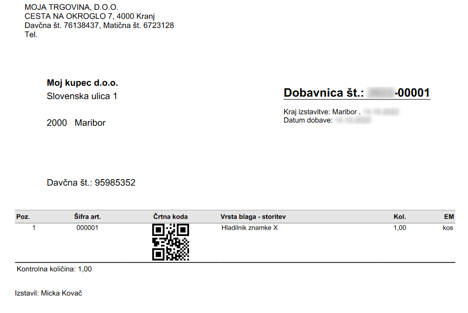 Na sliki je prikazana dobavnica z izpisom črtne kode formata QR: