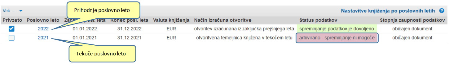 3. Ko ste zaključno temeljnico za tekoče leto poknjižili je smiselno poslovno leto tudi arhivirati oz. “zakleniti” za spreminjanje. To storite tako, da v meniju “Finance -> Šifranti in nastavitve -> Poslovna leta” kliknete na poslovno leto in spremenite status podatkov na “arhivirano – spreminjanje ni mogoče”.
