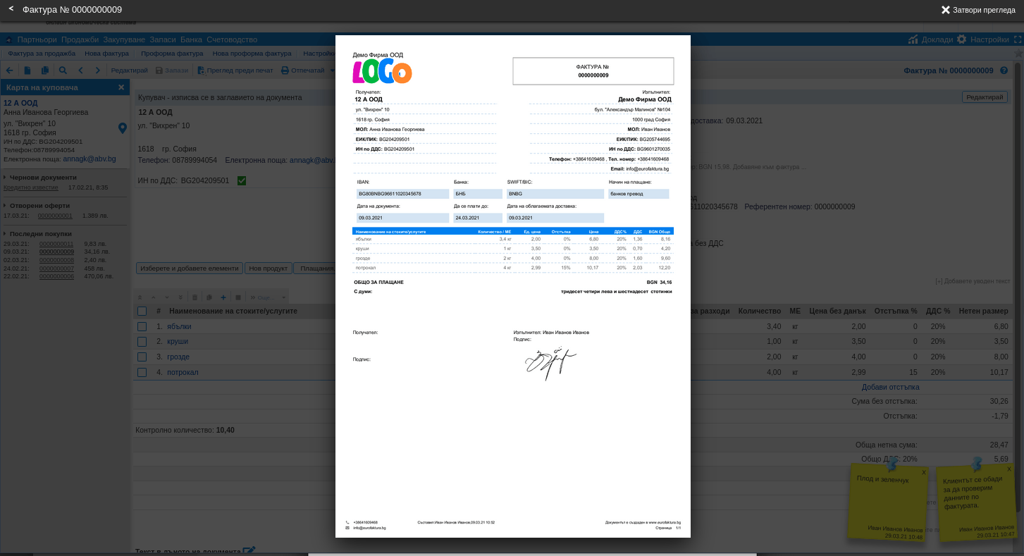 Независимо дали става въпрос за проформа фактура, бележка за доставка, фактура или кредитно известие, можете да прегледате документа си преди да бъде издаден, за да се уверите, че всички данни са правилно въведени.
