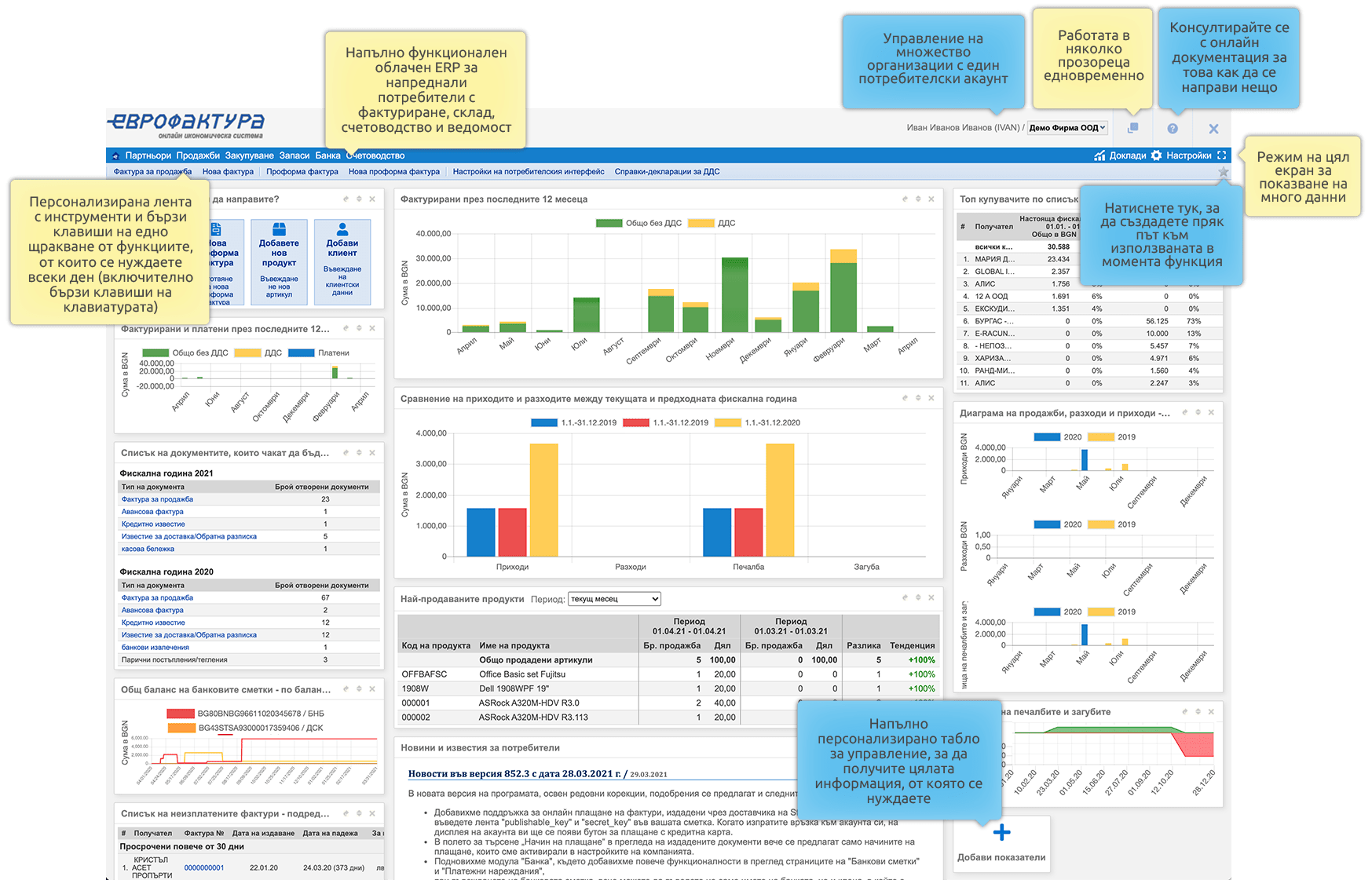 Всеки път, когато влизате в програмата, се зарежда ВАШЕТО табло за управление. Напълно персонализиран екран с приспособления за най-полезната информация и най-често използваните от вас функции.