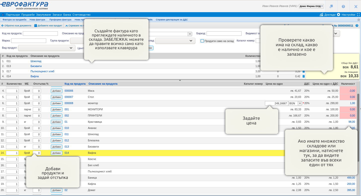 Може лесно да добавите продуктите към фактурата си и да зададете отстъпката на момента. Проверете наличността във всеки склад поотделно и дали продукта вече е бил резервиран, или е наличен.