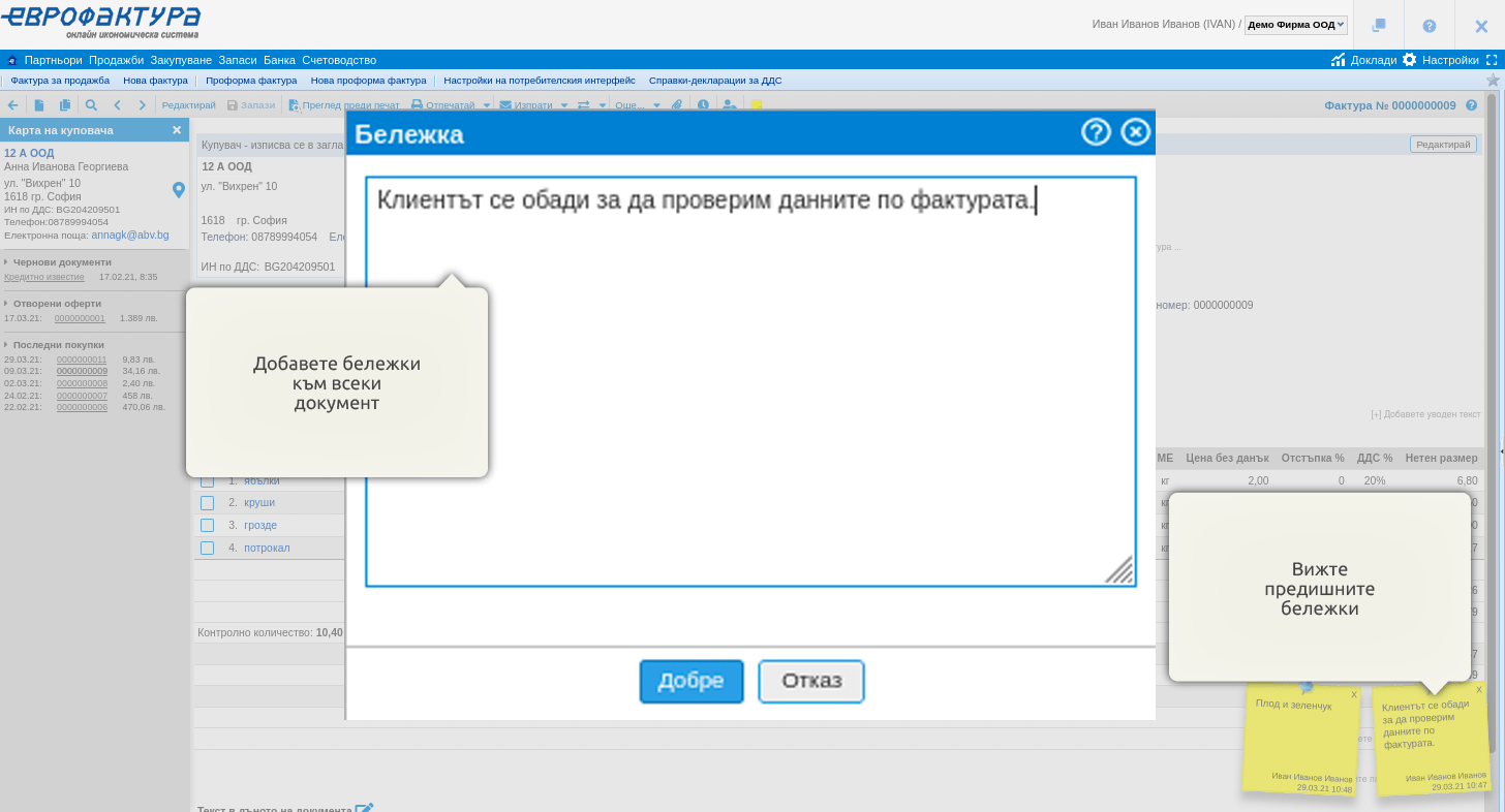 Най-умната функция на програмата: виртуален post-it! За да отбележите във всеки документ напредъка, обратната връзка с клиента и много други неща. Няма нужда да помните подробности на ум или да записвате бележки в отделен файл!