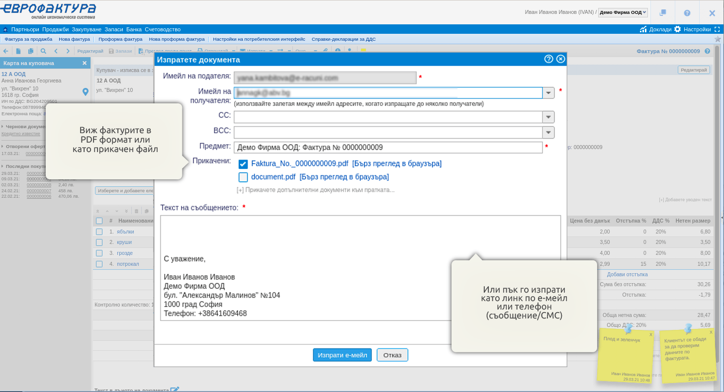Добавихте продуктите, настроихте ставките по ДДС и отстъпките, добавихте разходи за доставка, проверихте визуализацията – вече сте готови да издадете и изпратите фактурата на клиента си. Можете да го направите лесно чрез SMS или имейл, благодарение на референтната връзка на този документ. Клиентът може да я разгледа като PDF или като приложена електронна фактура.