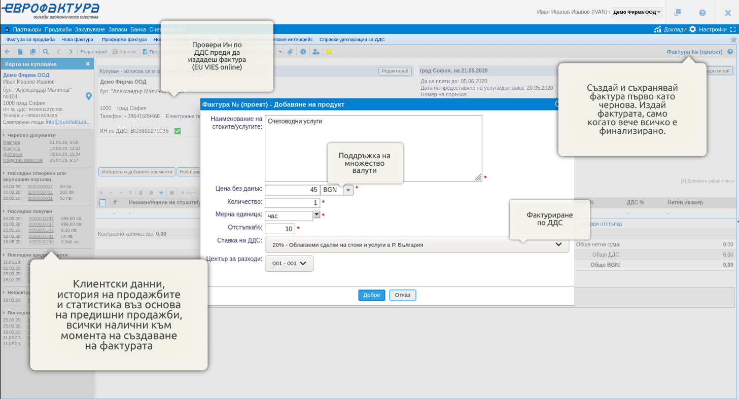 - персонализирана бледо синя лента с инструменти с бързи команди за най-често използваните функции (например нова фактура или справка-декларация по ДДС)