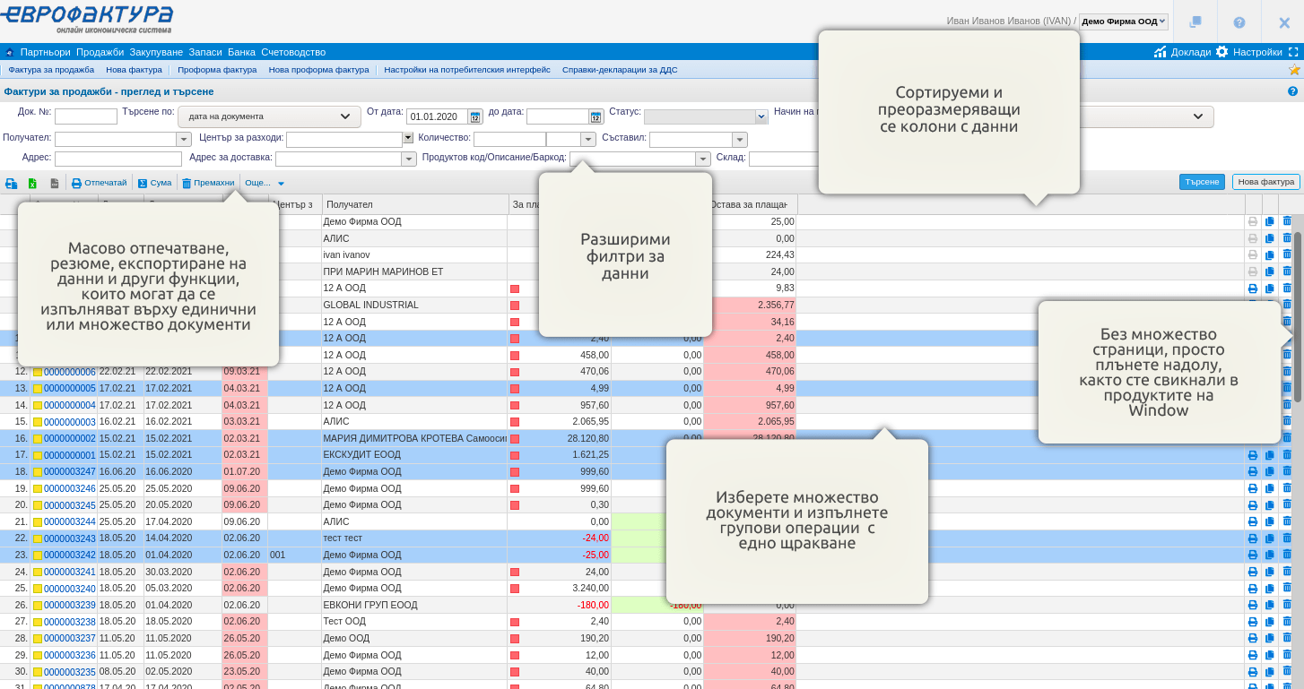 Работата по няколко документа едновременно ви позволява да не губите време и да действате функционално. Колоните могат да се пренареждат, бихте могли да използвате филтрите, за да видите само документите, които ви интересуват и да ги отпечатате или експортирате само с няколко кликвания!