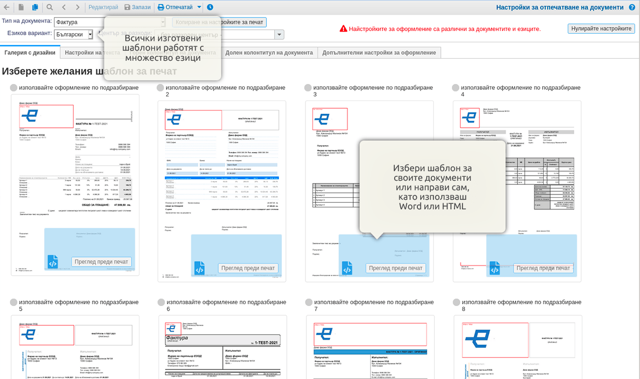 Изберете предварително зададените шаблони от нашата галерия, като намерите този, който най-добре отговаря на вашата фискална рамка. Също така имате възможност да създадете персонализиран шаблон за вашата компания, във формат WORD или HTML, и да го добавите в галерията. Ако искате да добавите вашия стил и характер, но нямате възможност да направите изцяло нов шаблон, имате и друга опция – да персонализирате полетата от оформлението по подразбиране.