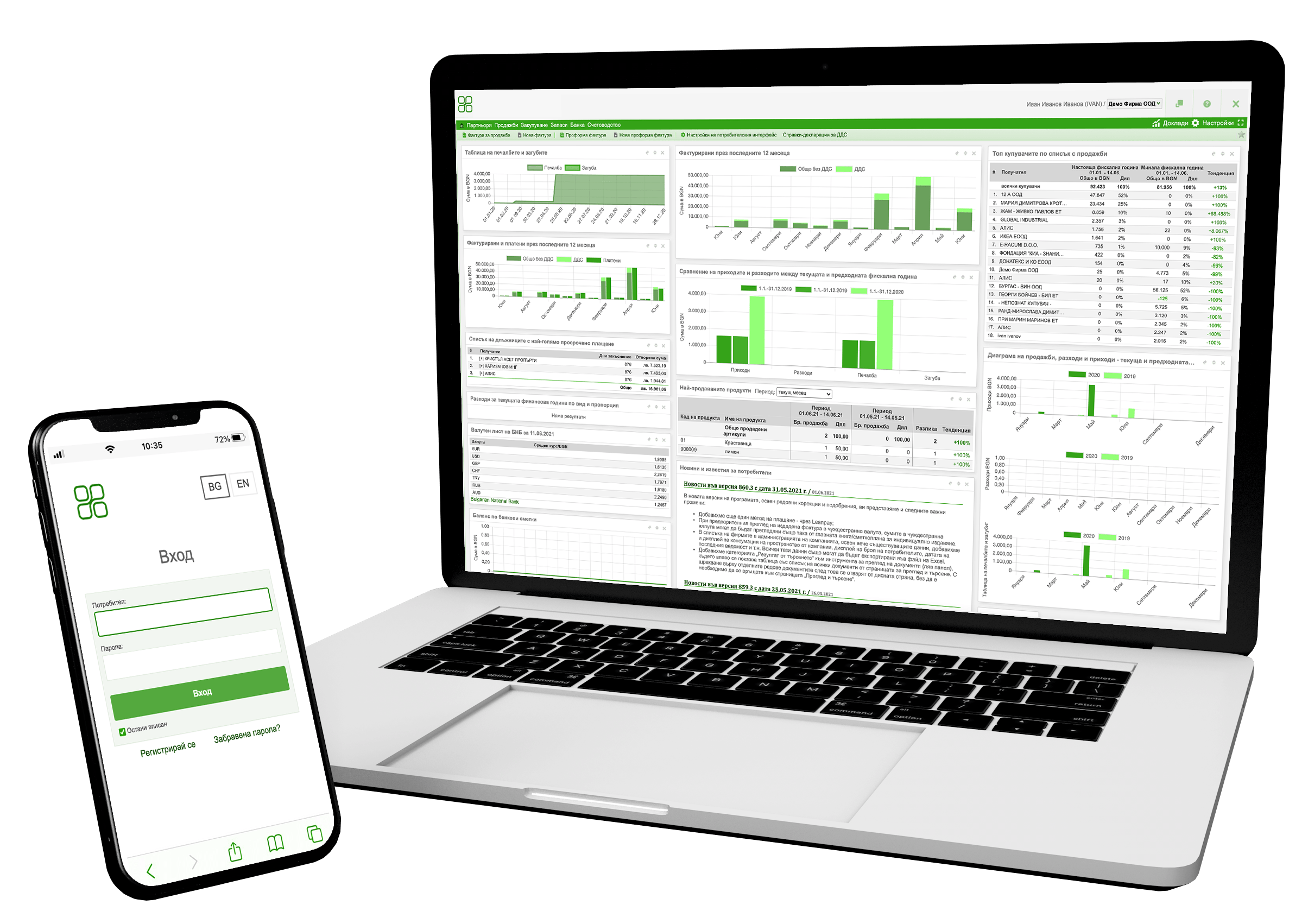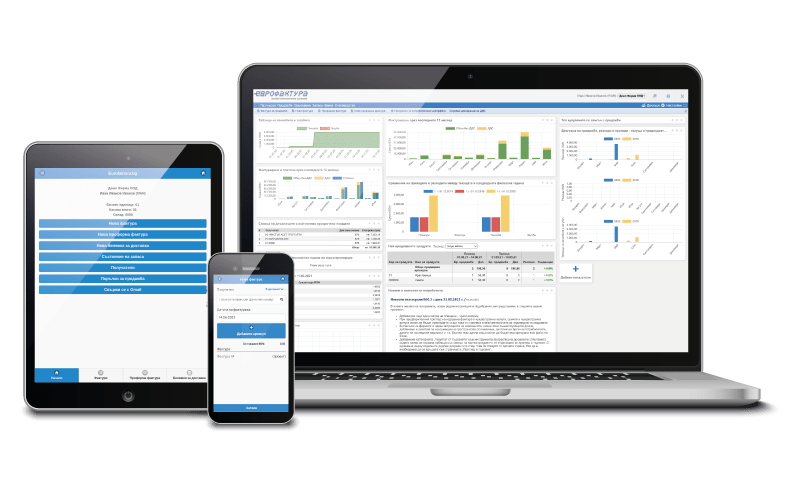 Наличен е моментален преглед на важни бизнес данни без нито едно допълнително кликване. Мобилен телефон, таблет или друго устройство? С Еврофактура можете да управлявате счетоводството си от всяко устройство и по всяко време.